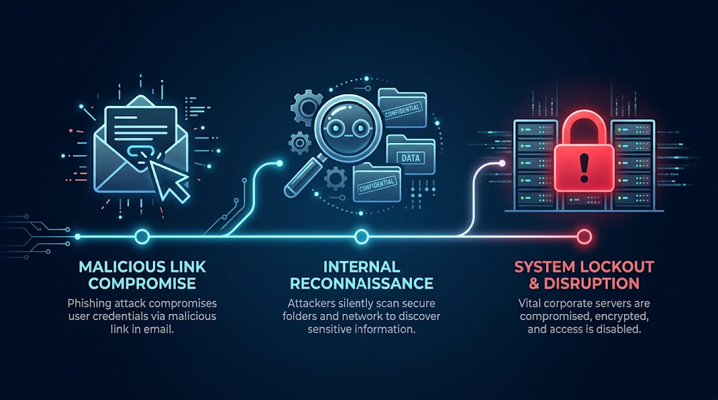 | The real business cost The financial damage from a breach like this is not just the immediate theft or ransom. It is the weeks of downtime, the cost of a forensic investigation (hiring specialists to trace exactly what the attacker accessed and how), the legal requirement to notify affected customers and regulators, the reputational damage, and the cost of rebuilding compromised systems. The earlier an intrusion is detected, before the attacker reaches your most critical systems, the smaller the damage and the faster the recovery. |